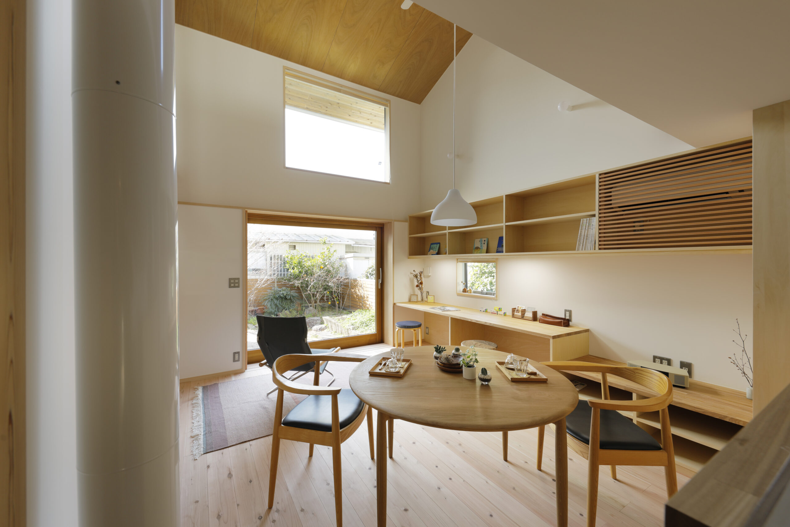 リビングダイニングの上部は吹抜けになっていて、壁に沿って収納や共用のカウンタースペースを配置。