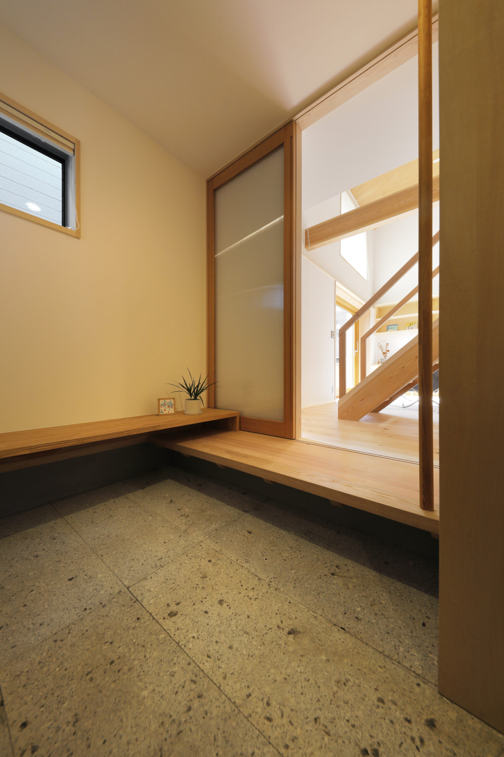玄関は下駄箱をやめて奥にシューズクロークを設け、土間には大谷石を敷きました。