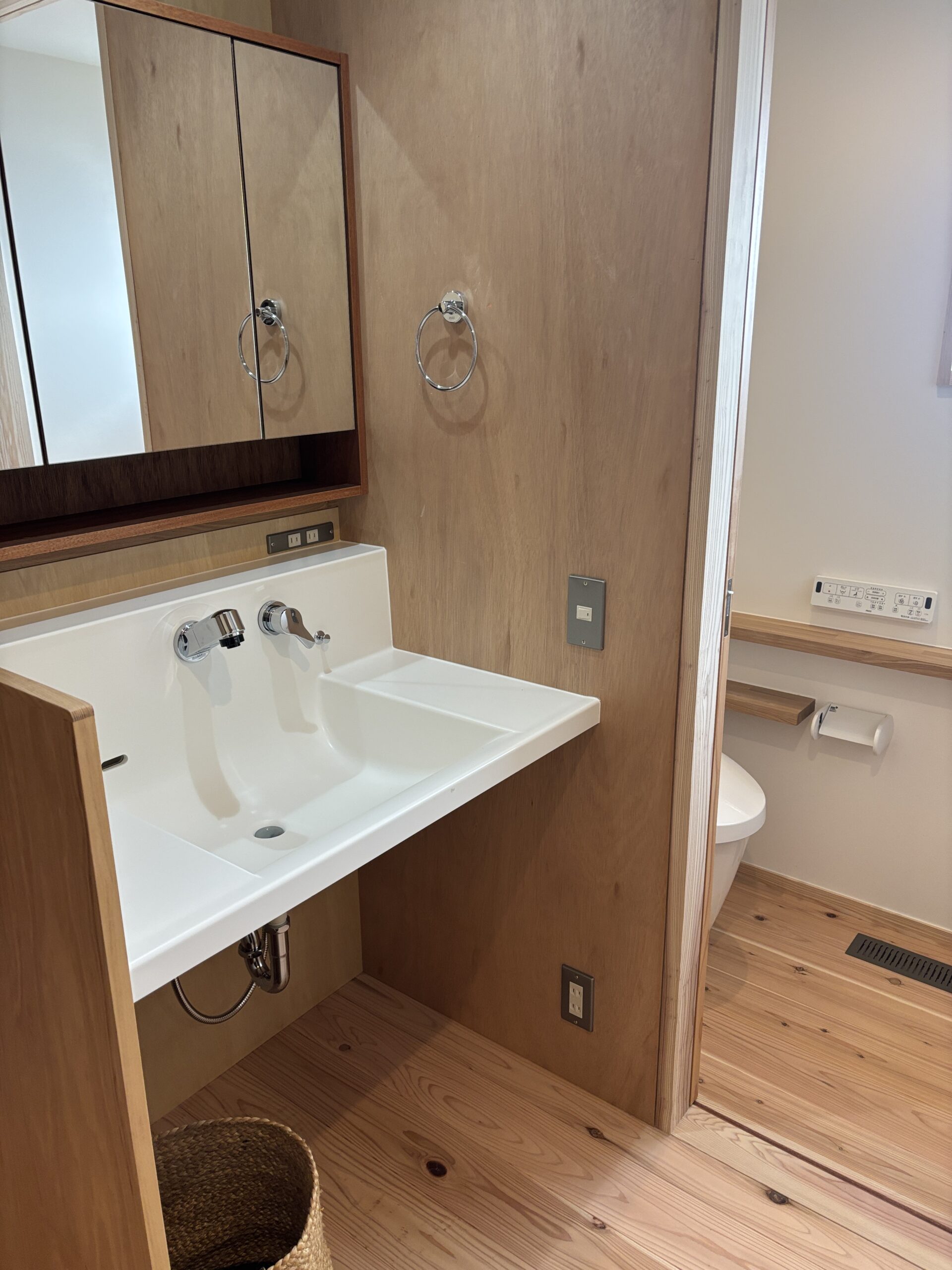 洗面はミラーキャビネットも含めて既製品をうまく活用してカタチにしています。