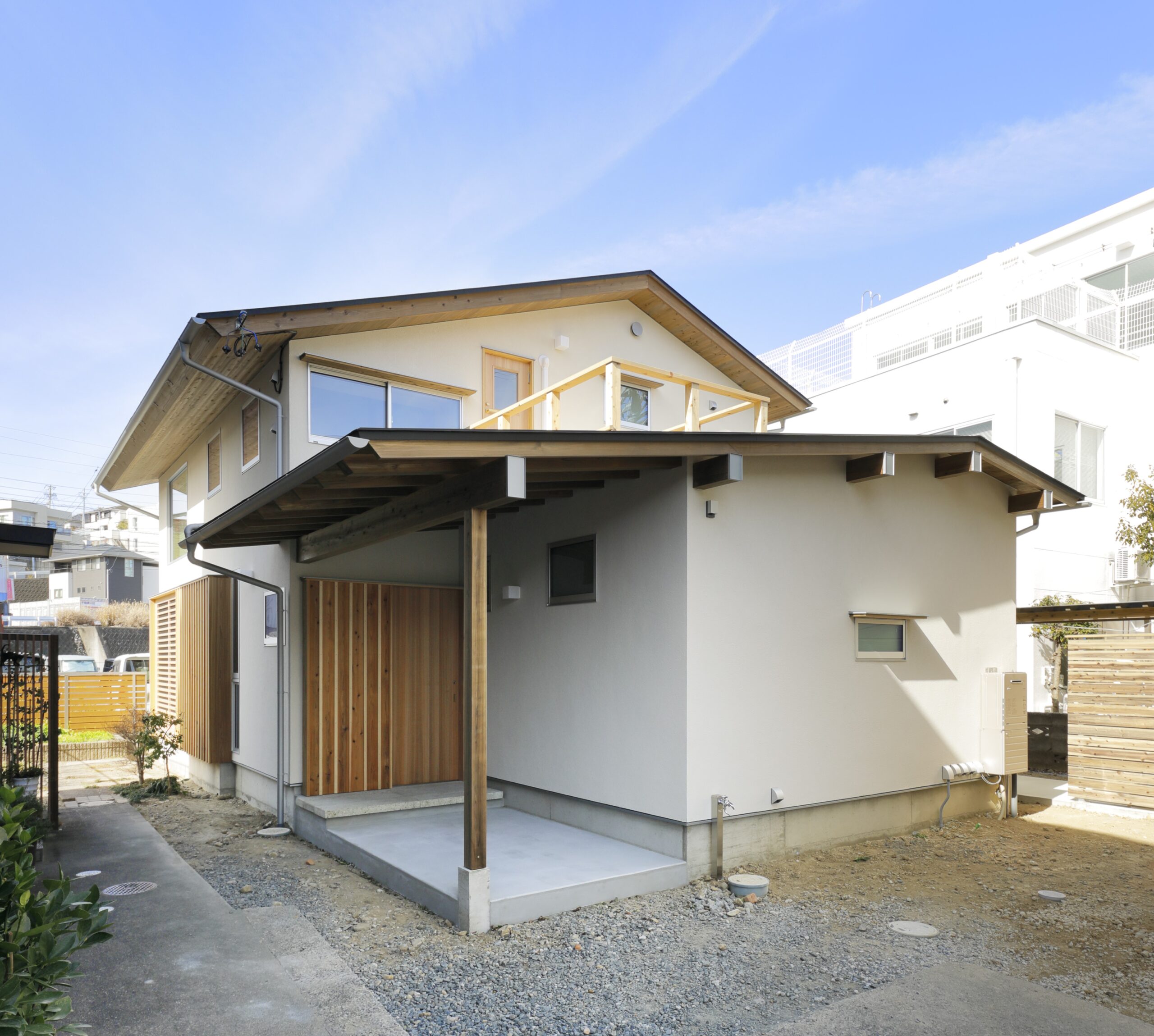 道路から少し奥に入った立地。外観は全面左官塗り壁で仕上げたやわらかな佇まいが特長です。